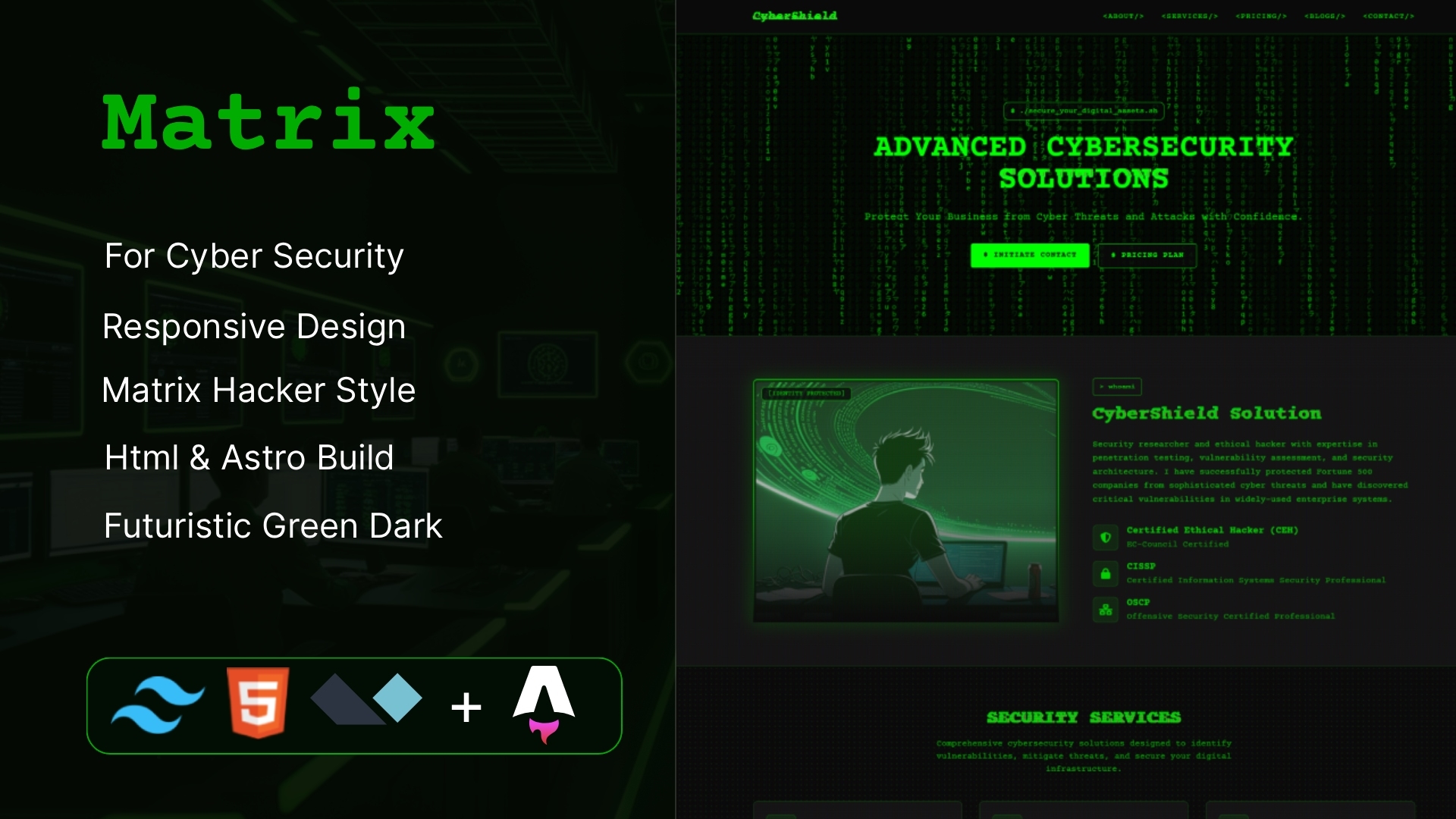 Matrix is Astro template for cybersecurity professionals, ethical hackers, and tech firms aiming to showcase their cutting-edge security solutions with a bold, hacker-inspired aesthetic