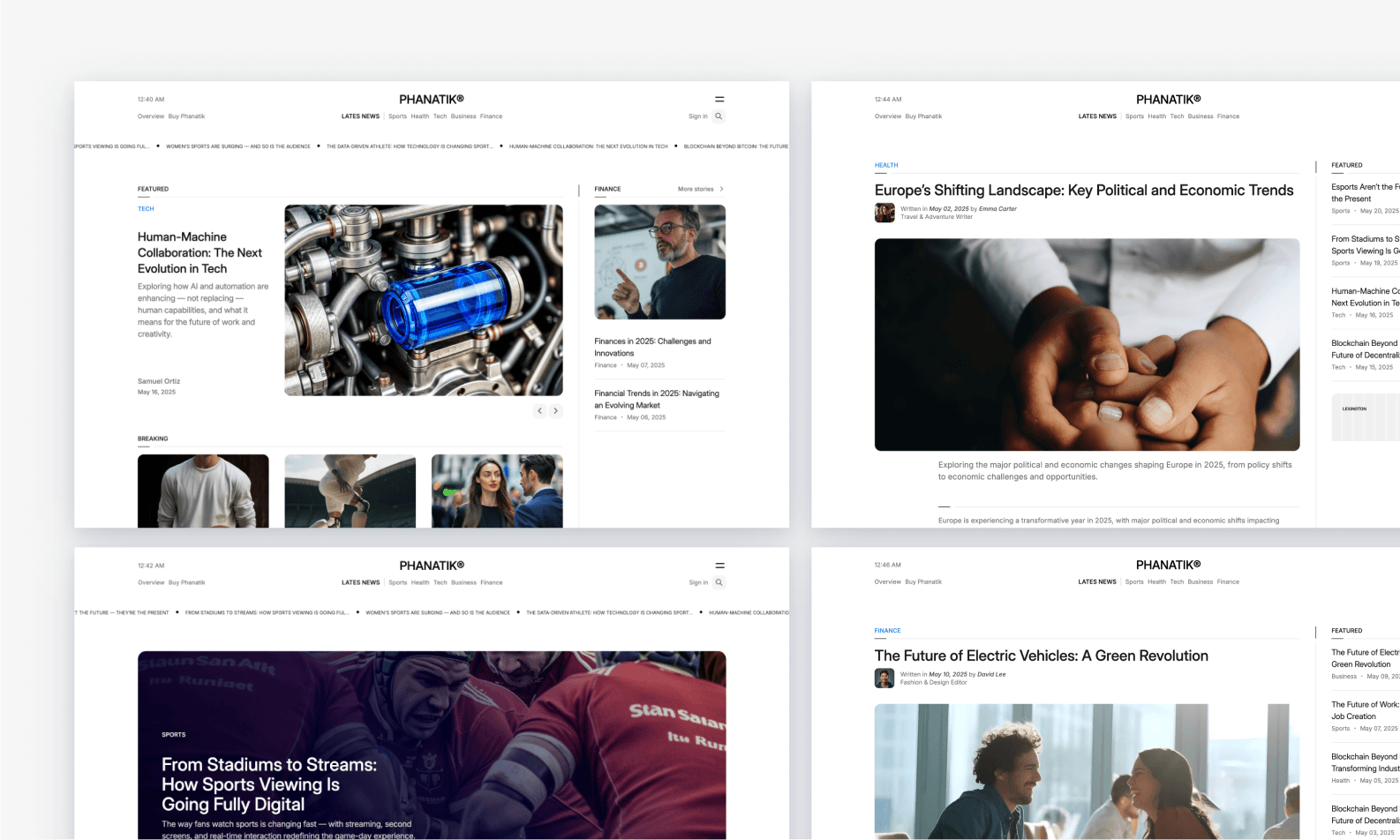 Phanatik is a high-contrast blog and podcast template with oversized headlines, clear structure, and support for paywalls, author profiles, and subscriber content.
