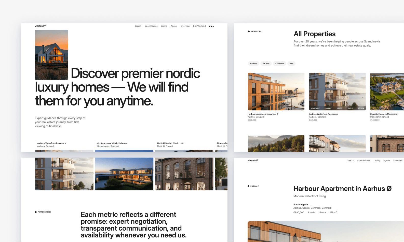 Westend gives real-estate teams a layout system that’s clear, trustworthy, and easy to scale. It includes everything: listings, agents, neighborhoods, valuations, and real client stories — all structured and ready to ship.